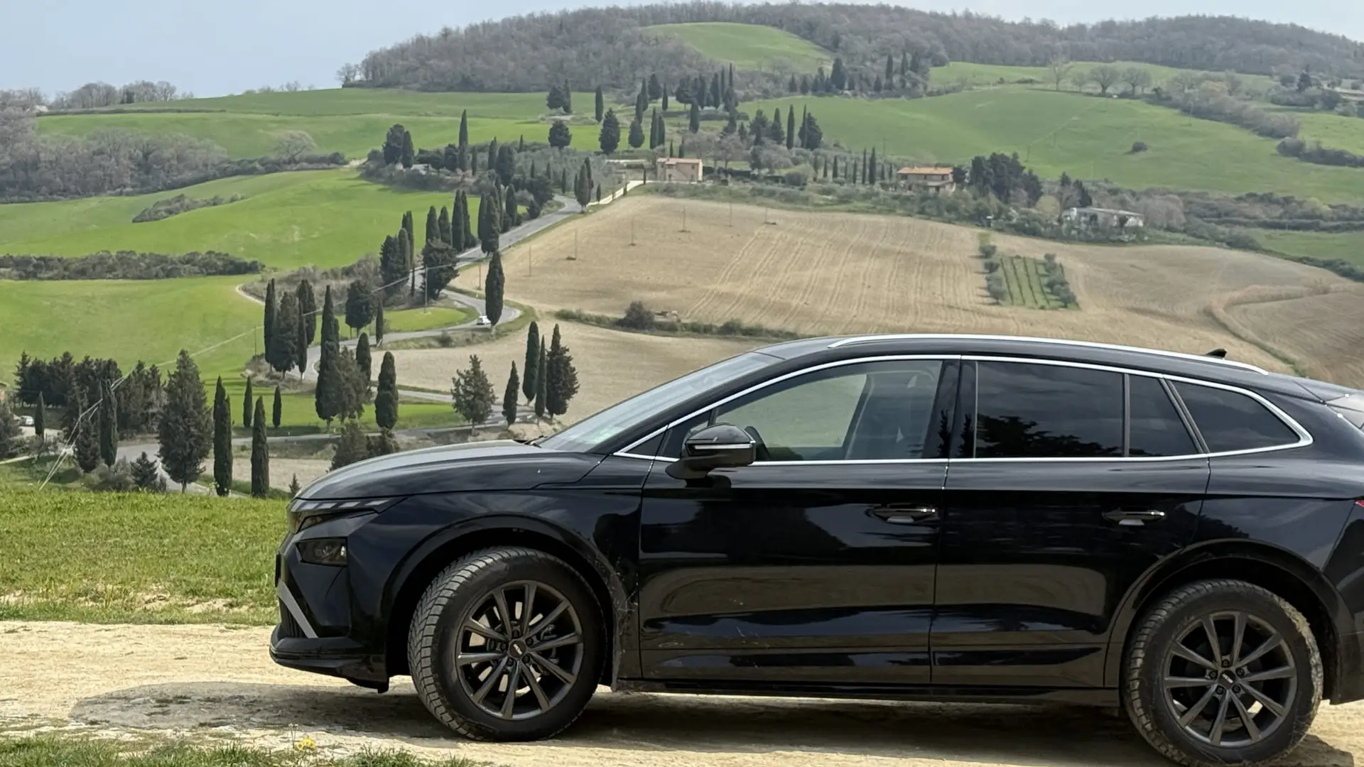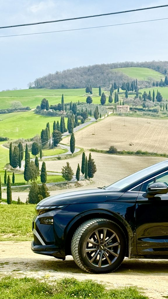 Die Tour geht weiter über Regional- und Provinzstraßen nach Süden. Das Ziel sind diverse Motive aus dem „Gladiator“-Film mit Zypressenalleen und alten Gutshöfen in Richtung Val d‘Orcia. Hier kommt uns der kleine Wendekreis und der agile Elektromotor des Skoda Enyaq zu Gute. Die engen und steilen Kurven meistert Laura ohne Probleme und Anstrengung. Ein Fahrspaß fast wie beim Motorradfahren. Wir übernachten in Montepulciano und in Montacino.